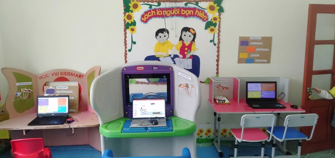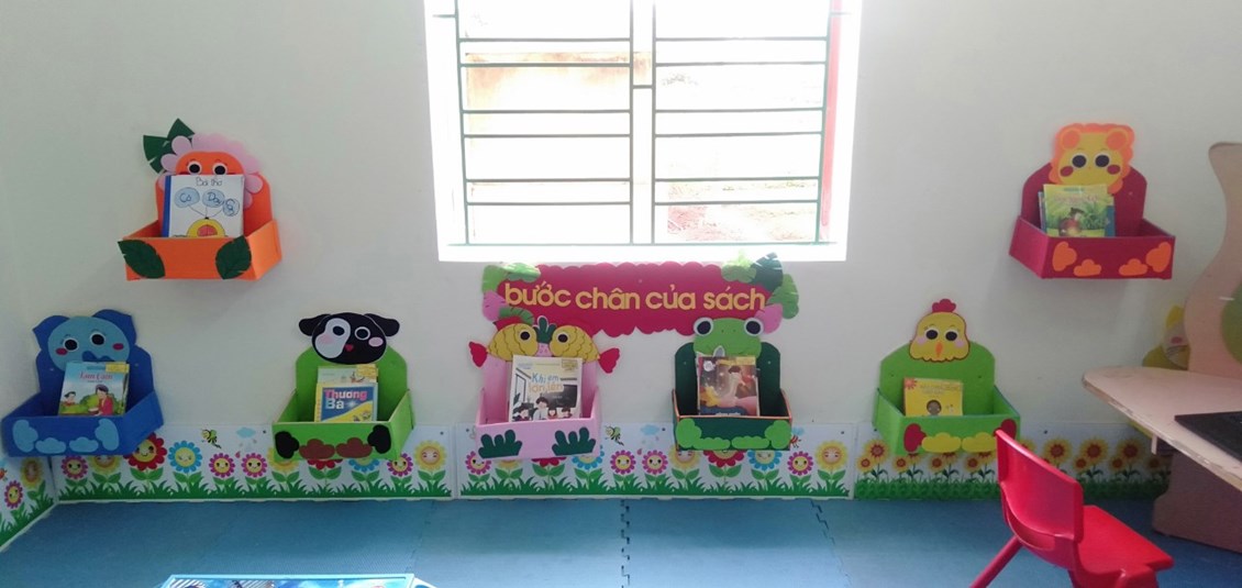 Năm học 2022- 2023 nhà trường đã đầu tư hệ thống bàn kismat, máy tính, tai nghe hiện đại. Ban giám hiệu nhà trường đã tận dụng không gian dưới cầu thang làm thư viện sách, địa điểm để bố trí thư viện đảm bảo có không gian an toàn, đủ ánh sáng cho trẻ dễ dàng hoạt động.
