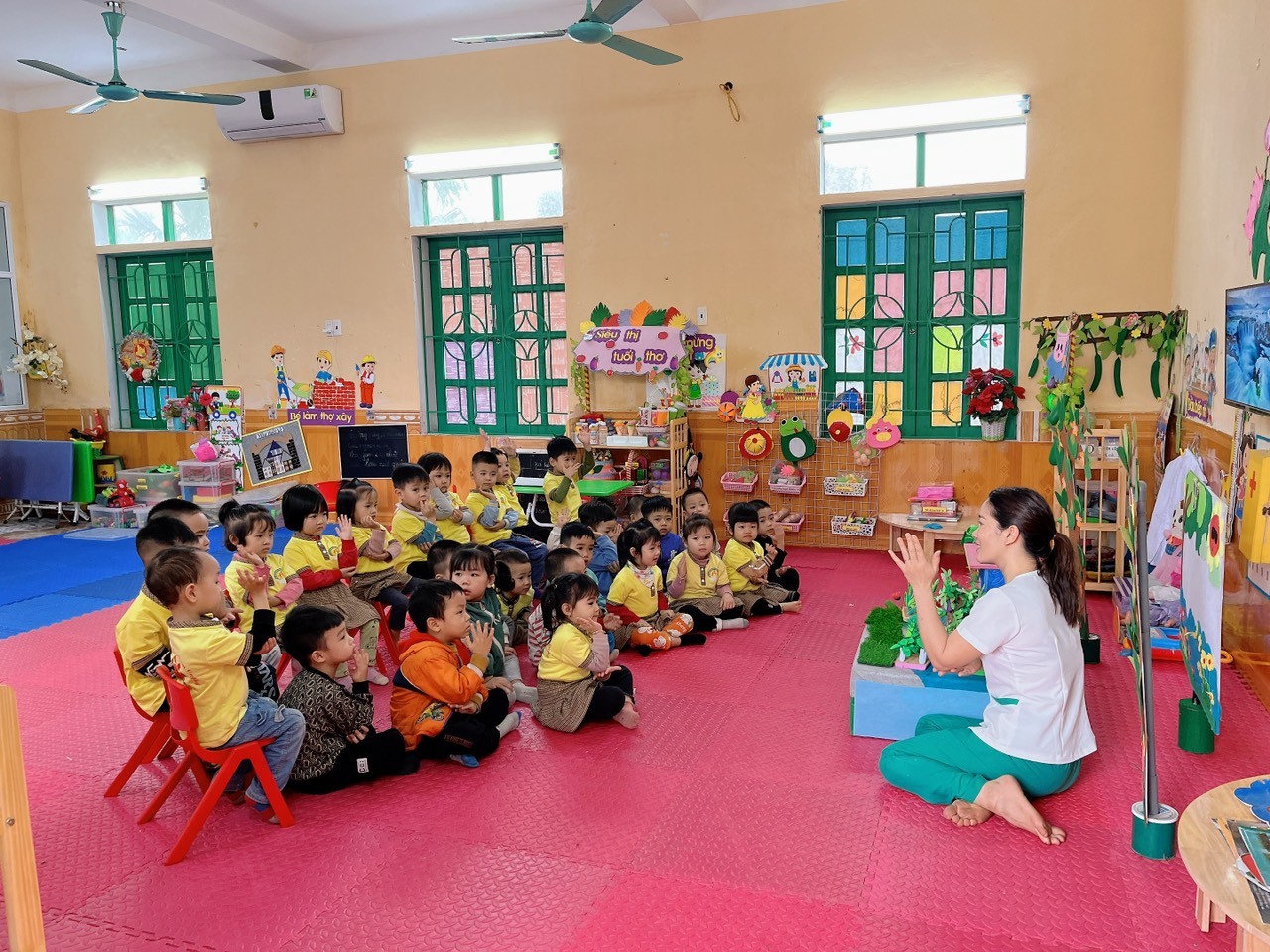 - Mở nhạc cho trẻ nghe và nhắc nhở trẻ ngồi đúng tư thế,